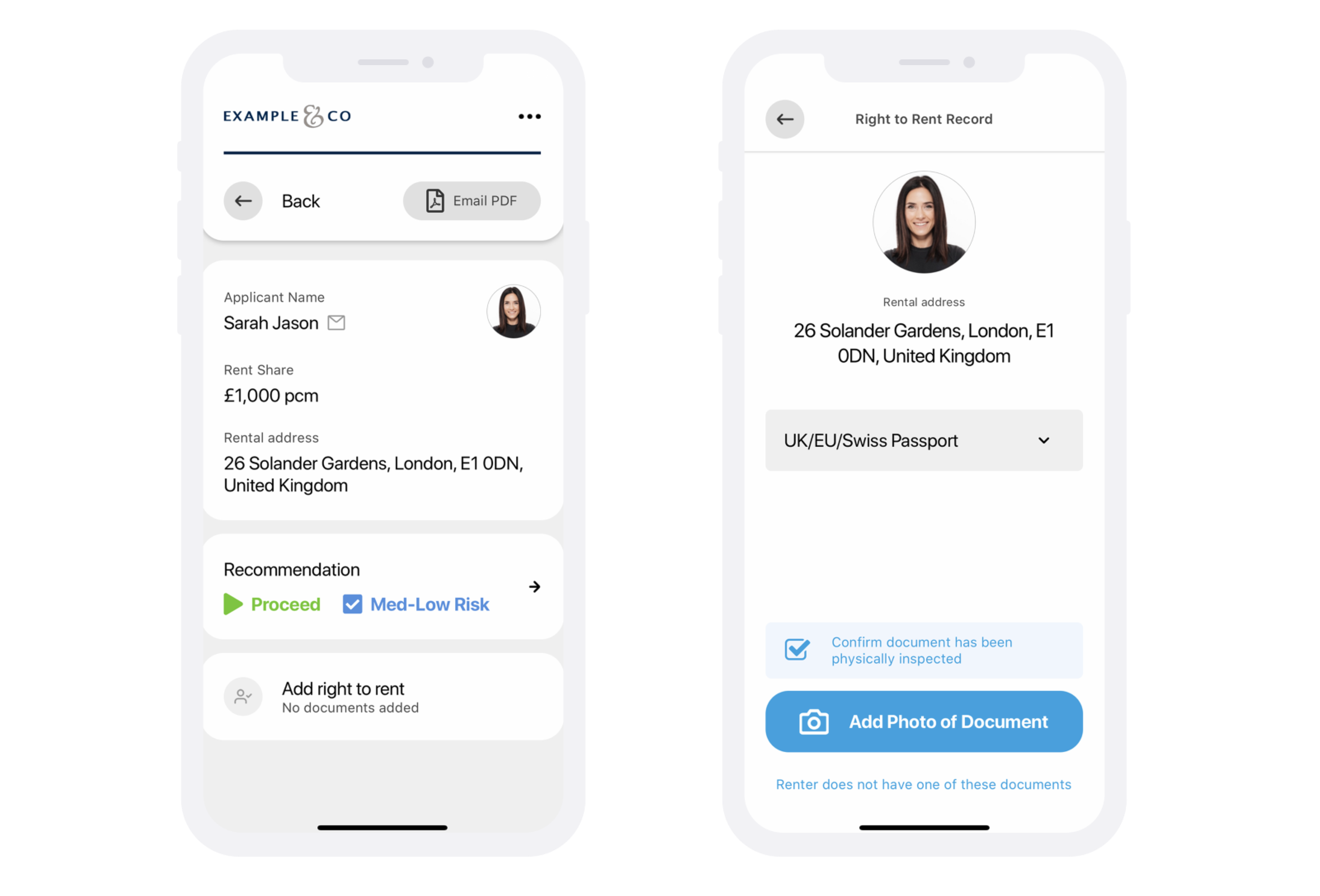 You can also use the Agents app to manually complete Right to Rent checks. Securely capture Right to Rent documents in-person including during viewings; access copies of documents in the Agent Dashboard (with relevant permissions); demonstrate that Right to Rent checks have been conducted on their Referencing report; and get alerted to expiring documents.